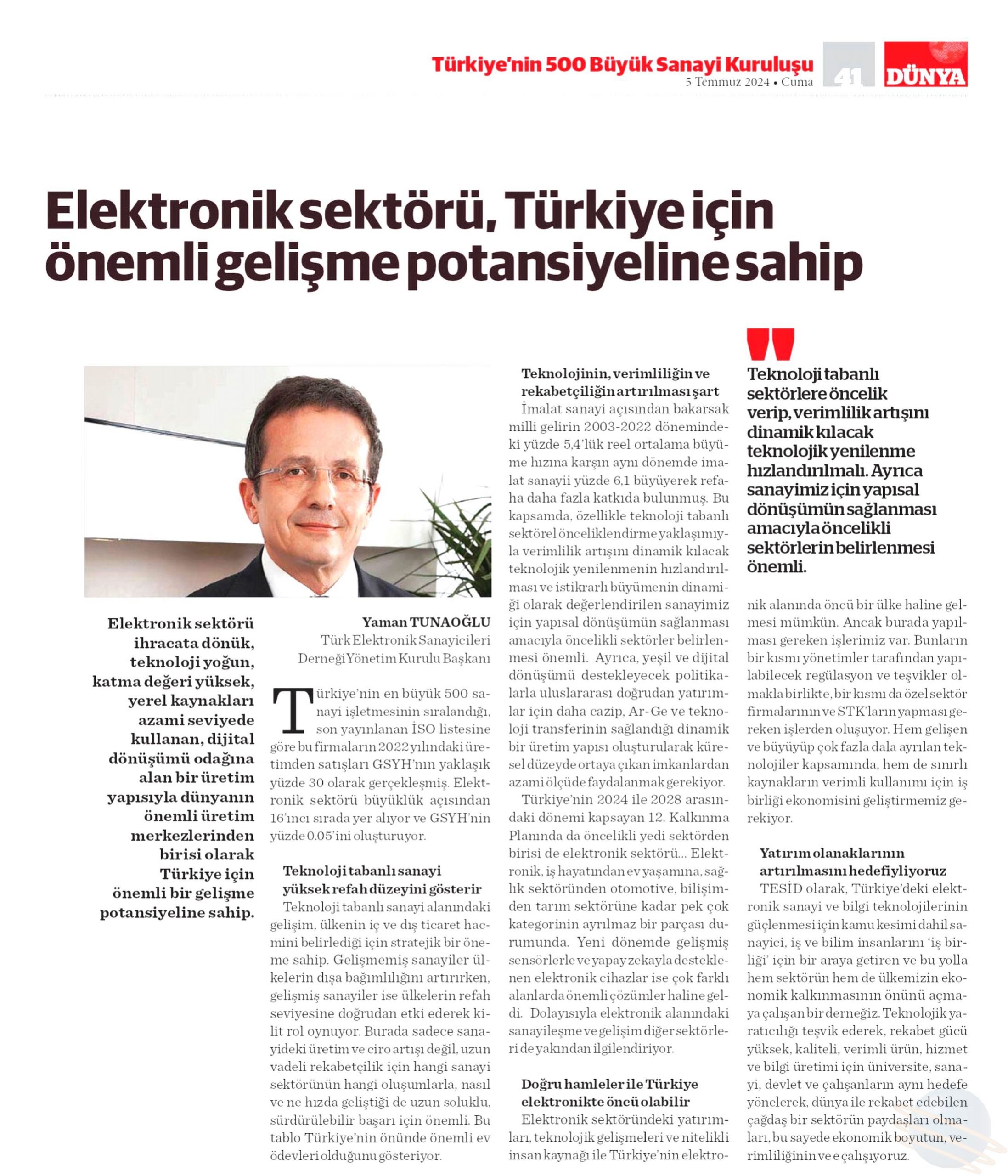 TESİD Yönetim Kurulu Başkanı Yaman Tunaoğlu sektörün  mevcut durumu ve gelişme potansiyeline yönelik değerlendirmelerini Dünya Gazetesine yaptı.  Tunaoğlu; Elektronik sektörünün, ihracata dönük, teknoloji yoğun, katma değeri yüksek, yerel kaynakları azami seviyede kullanan, dijital dönüşümü odağına alan bir üretim yapısıyla dünyanın önemli üretim merkezlerinden birisi olarak Türkiye için önemli bir gelişme potansiyeline sahip olduğunu vurguladı.